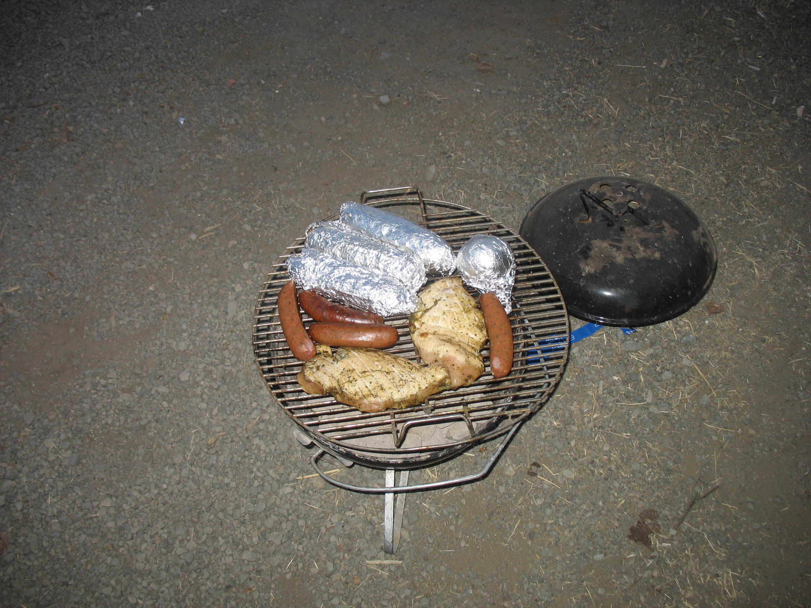 The dinner hour lasted at least two hours. The usual meeting time was long before sunset. There was plenty of time visit Cal Mart to buy food and charcoal. The coals were encouraged to get hot in a hurry with the application of A.D.'s leaf blower. The sausage, corn, steak, chicken and whole onion simmered as the participants exchanged pleasant banter and whiled away several hours. A discussion of Teva's and their lack of styling seemed important. Ride options were pressed further by Jim.