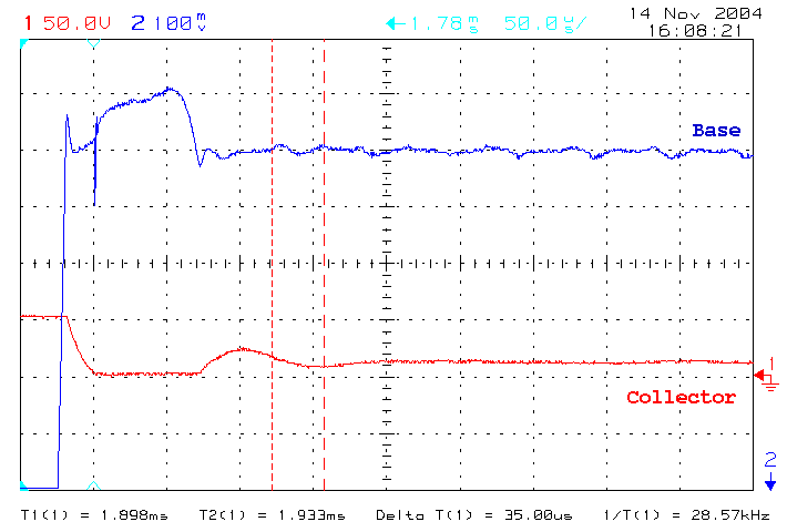 | These plots show the delay between the trigger edge and the driver transistor turning on. Also note the speed at which the transistor does turn on. These where taken before any modifications to the compensation network. After the series resistance was added there was no change in the slew rate of the collector voltage. |