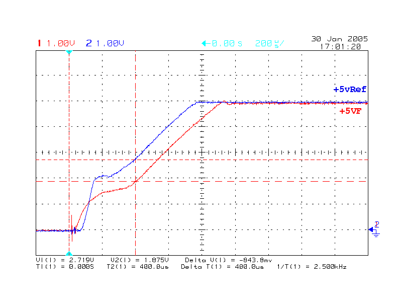 This is what it looks like with the delay. The +5VF supply is clearly stabilized before the reference comes up.