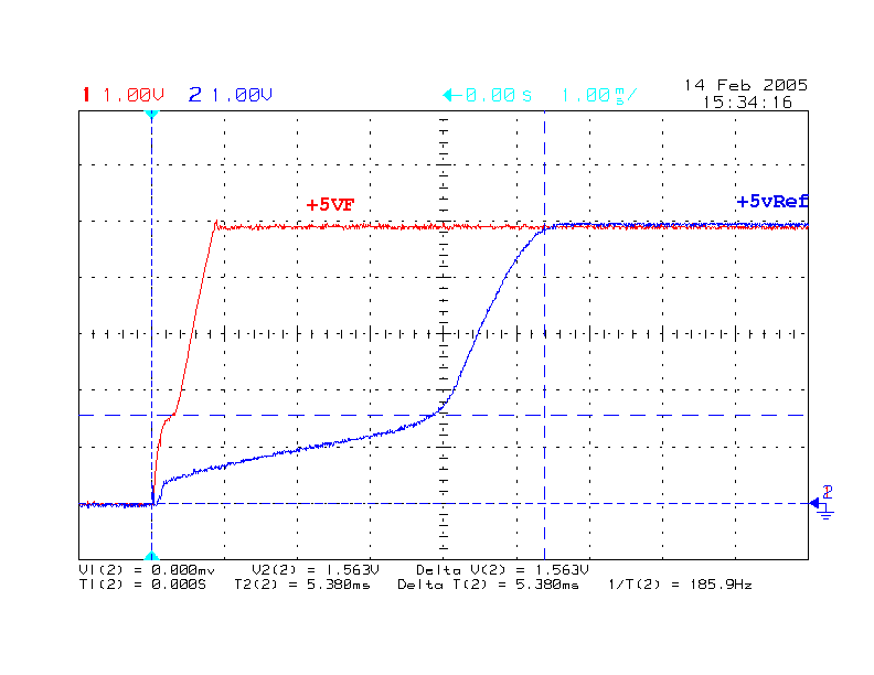 Another possible solution to delaying the turn on of the +5 VRef supply is to increase the capacitance load it sees. The delay waveforms show two distinct slopes. Initially it charges at very low rate. This is because the cap held the voltage low long enough so the fold-back circuit turned off the boost transistor. During this period of time it charges at the LT1021 current limit rate. As soon as the voltage gets high enough and turns off the fold-back transistor then it charges at the current limit rate of the boost transistor which of coarse is much faster. This fold-back is what makes it a little strange. If you use a small cap, say 22uf, you do not get half the delay as the 47uf does. In fact it does virtually nothing. As all the supplies are coming up and the devices are getting potential to work a smaller cap gets charged too fast and the fold-back doesn't kick in so the filter cap is charged at a 200ma rate so there is very little affect on the turn on time. Get just large enough cap to activate the fold back and it really stretches it out. If the fold-back wasn't there would need a cap in the multi hundred uf range to slow things done enough. Another thing to watch out for is as the output cap gets very large then when the power is removed from the unit the turn-off times become a problem. Look at the 220uf turn-off plot below and you will see the the +5VRef is a volt higher then +5VF again.