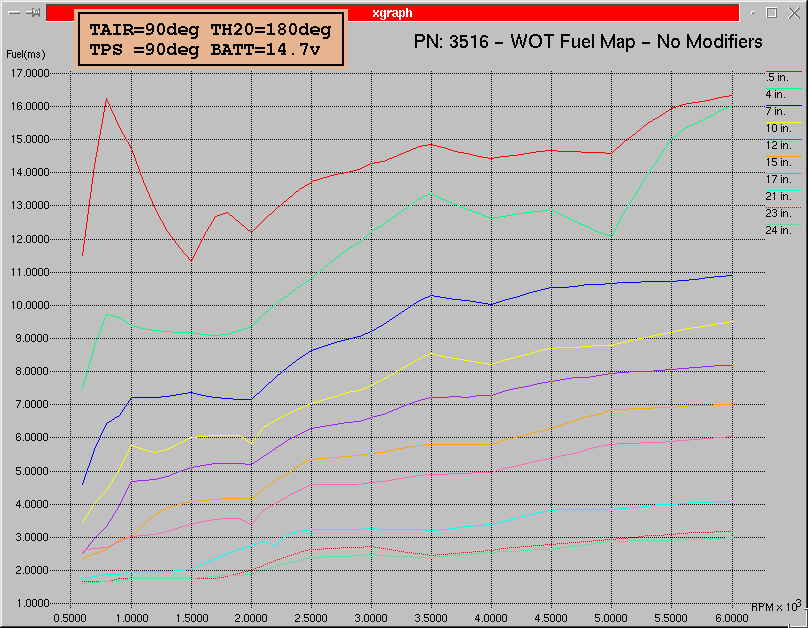 Here is one for the #3522 EPROM. Kind of interesting that this motor needs the same amount of fuel around 5000 rpm at .5 in and as it does at 4 in. I sure wish I could be around when these values were originally generated to see what the design criteria was.