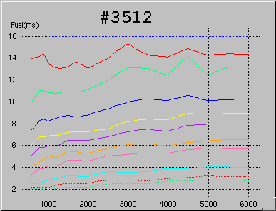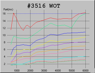 Kind of interesting looking at these plots along side of each other. Notice how as the size of the cam goes up the fuel maps get leaner ? On the surface you would think that they should get richer. Don't know if it because an EFI system reacts to the manifold pressure differently than you'd expect. I guess what this really means to keep a given AFR with a larger cam you have to give it less fuel because less air is going into the motor. Doesn't sound right does it. Doesn't feel like it either when you floor it ! Also some of the bumps in the curves are a curious, especially on the 3516 ROM at low RPMs. You wouldn't think that the demand for fuel would change so rapidly over such a narrow RPM range, would you.