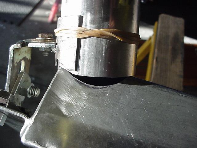 off of a common mounting hole that wrapped around the original filler neck. Then using this jig I fit the new neck to the tank. Not so easy to