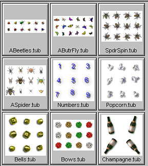 Picture Tubes--allows for a sequence of pre-made images to be inserted as the user clicks and/or drags the mouse across the image, letting users easily apply and reapply clipart or other graphic objects to their images. Tubes are in! Many Web sites have sprung up just to offer picture tubes to Paint Shop Pro users and Jasc Software constantly has free Picture Tubes to download. (See the Recommended Demos Section on our site for the link.) Picture Tubes are really just a form of the paint brush tool; it is like a rubber stamp in that it allows you to reproduce the same image, or set of images, again and again. You can use tubes to create seamless backgrounds or backgrounds for logos. Tubes are built from images arranged in a grid. A tube can consist of one object in a variety of colors and/or effects, or a variety of related objects. The image on the right is a screen shot of some of the tube files that come with Paint Shop Pro and shows how they are arranged in cells.