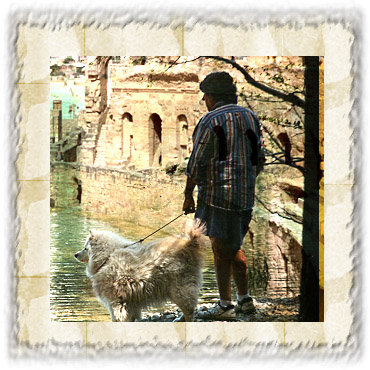 Arithmetic Function--This is feature that truly creates unique images. I used the image arithmetic function to combine data from two images; I used the figure, water, and dog photo (my own) and a photo of a building from the Paint Shop Pro CD to create a third image that is a product of the source image's color data. Different formulas will result in different effects. You can combine images using the following options: add, subtract, multiply, difference, lightest, darkest, average, or, and. An interesting image can be created by combining the arithmetic function and effects and then changing the opacity and blend mode.