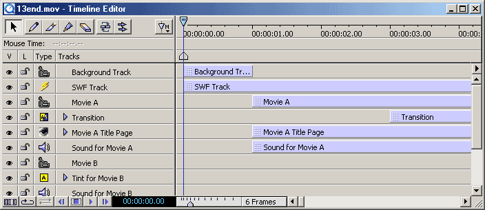 GoLive 6.0 is the only Web authoring program that uses streaming media technology deployment for full QuickTime 5.0 editing, extended support for SWF files created or exported by Adobe LiveMotion, and Windows Media player files, DHTML and SMIL 1.0. See the image to the left for a view of the Timeline Editor in GoLive 6.0 that is used for editing movies. |