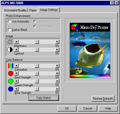 cartridges, to apply ink to the paper. Since the inks are Alps Electric has been in business since 1976. They make floppy disk drives, keyboards, and invented the touchpad used on notebook computers. They produce a variety of electronic products from computer peripherals such as high contrast LCD panels and disk drive components, to electromechanical controls for the automotive industry, and audio and lighting control applications. Their Web site is worth checking out: http://www.alpsusa.com The Alps MD-5000 is available with either a bi-directional parallel port for Windows-based systems or a SCSI module for Macintosh OS V7.01 or later. Price: PC Printer ($599); Mac/PC Printer ($649). Optional features are: Dye Sublimation Kit ($99); USB Interface Kit for the iMac OS V8.01 and Windows ($99); and Adobe PostScript 3 with Pantone Color Matching for Macintosh ($149.99). |