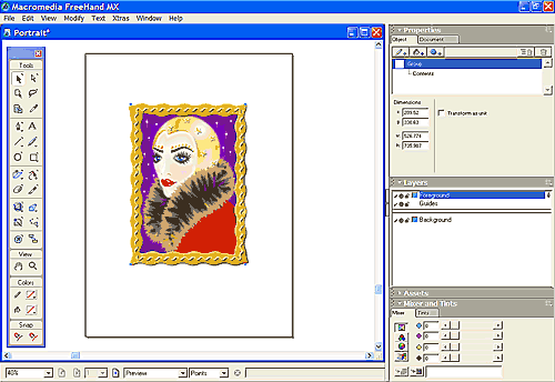 | The Macromedia Studio MX interface streamlines productivity and design with a customizable, integrated workspace. Dockable panels can be grouped together, collapsed, or expanded as needed. Other consistent user-interface elements make your job easier when working within Freehand MX—as well as other Macromedia MX applications. See the image to the left for an example of the new interface with dockable panels. | |