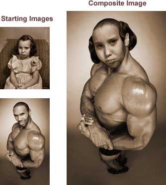 • Move & Transform: 24 min. -- The Transform command for scaling & distorting; transforming options; nudging from the keyboard; compositing images: Moving & Cloning; introduction to layer masks; creating a basic layer mask. This section walks you step by step through the process of creating a composite image using the Transform Command and other techniques. See to the left for a view of the starting images and the final composite.