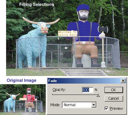 • Fill, Stroke, & Color: 28 min. -- Color theory in Photoshop: RGB & CMYK; defining foreground & background colors; using the Color palette; applying fills, blend modes & gradients; using the stroke option. Lots of tips on filling selections with patterns and color, plus how to use the Fade command to edit fills. I found this section really helpful. Using the Fade command to edit fill is great because it has a preview window which the Fill command doesn't have. You learn to fill with a pattern or with a color. See image to the left for a view of the starting image, ending image, and Fade dialog box. Babe is filled with a pattern, and Bunyan's shirt and hat have been filled with a color.
