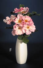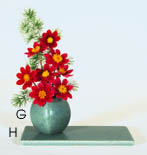 Tapered Vases have a soft and understated shape that is a natural with flowers. Both the 7" and 11" Tapered Vases (‘B,’ ‘D’ and ‘F’) are great for easily arranging a bunch of flowers such as daffodils or a supermarket bouquet. I like to use marbles in the bottom to help hold the stems just where I want them; the marbles also add stability to the vase for tall flowers. For the Fat Tapered Vase (‘E’ above) a 1 1/8" Pin Frog (M2076) can be a real aid to arranging. For the Short Tapered Vase (‘C’ above and ‘G’ at right with a 4x8" Rectangular Trivet) I find a 7/8" Pin Frog (M2078) absolutely essential. The 5" Slender Taper (‘A’ above) is a good choice for a single flower or a bouquet of small flowers. It also can be set on a rectangular trivet for extra effect. If you need information about pin frogs, go to Pin Frogs. For complete dimensions for these vases see the chart directly below.