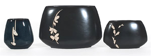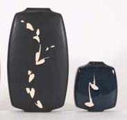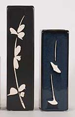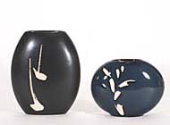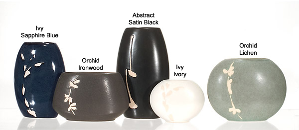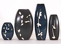 This line is currently available in the five glazes which are shown above: Sapphire Blue, Ironwood, Satin Black, Ivory and Lichen. The shapes used for brushwork need to be simple so that shape and decoration complement one another. A complete list of shapes, sizes and prices is given below. The Wall Vases have brushwork on one side only, and all of the rest have matching brushwork both front and back.