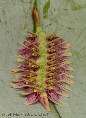 Sold out Acianthera/Pleurothallis pectinata #5505 outcross (approximately 25 seedlings per flask). The Species: Found in Brazil in the states of Rio de Janeiro, São Paulo, Paraná, and Santa Catarina at elevations around 1200 ft elevation. It was published as a Pleurothallis but was changed later change to Acianthera The leaves are pendant and “boat shaped”. The inflorscense comes from the base of the leaf and is shaded by the overhang of the leaf. The leaf usually starts upright and as it grows it arches and becomes pendant with the weight of the leaf. Sometimes it will emerge from the side of the container. It is best grown in a basket where the the leaves can hang free. The flowers can range from yellow to maroon and blends of the two. Culture: I have always seen this grown in a basket so the leaves can hang free. It is best grown in warm/intermediate to warm conditions, somewhat shady, with year round watering. I have always grown it in sphagnum moss but other media are possible. You want it to be moist but not soggy. Parents: Acianthera pectinata