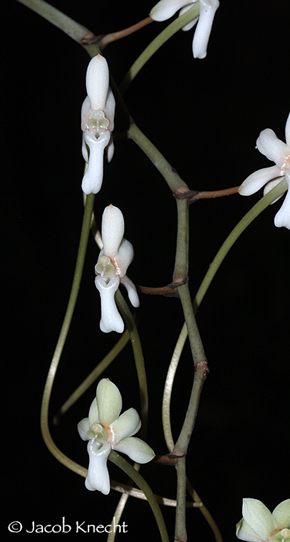 Sold out Aerangis coriacea spontaneous #1076 (approximately 25 seedlings per flask). The Species: It is found in Kenya and northern Tanzania growing at elevations from 5000 to 7600 ft. It grows as an epiphyte on trunks or large branches in shady, humid places. Culture: Grow in cool to cool-intermediate conditions. Images are not of the parents, but do show the true from of Aerangis coriacea.