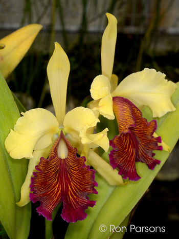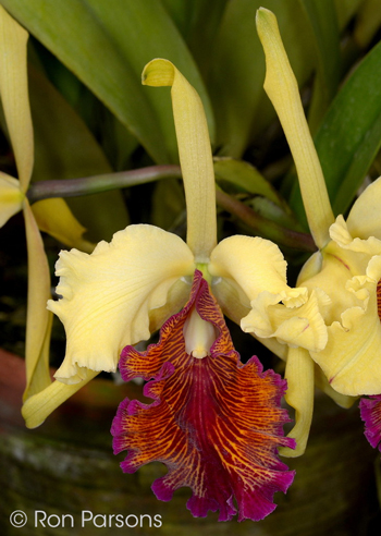 Cattleya dowiana is from Costa Rica, northern Colombia and probably Panama where is it found at elevations from 2000 to 5300 meters. It grows in bright filtered light on large branches usually up high in the crown of trees. The plants are about 12” tall and have a single leaf. It can have 2-6 flowers on an inflorescense with velvety flowers that are 5 to 8” natural spread with a pleasant fragrance. This species has some rather exacting cultural requirements for success. Culture: Conditions remain fairly constant during the year with days averaging 75 to 80F and nights averaging 58 to 62F. It needs good humidity all year and abundant watering during the growing season. In the winter, rainfall in the habitat is low but heavy dew provides moisture. Reduce water but do not let it go dry for extended periods without moisture. It is critical that the roots dry quickly and are never subjected to wet or soggy medium. Cattleya dowiana. I do not have images of the actual parents, so show here a representative example.