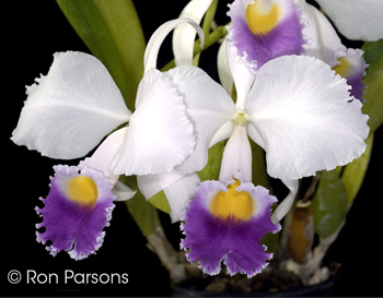 Cattleya trianae coerulea outcross #5826 (['Pedro Azul' x 'Camila'] x ‘Montclaire’)(approximately 25 seedlings per flask). The Species: This Colombian plant grows at elevations from 2600 to 4900 ft and is the national flower of Colombia. It was named after a Colombian botanist, José M. Triana in 1851. It is a variable species with many color forms and doesn’t have any demanding cultural requirements compared to some of the Cattleya species. The flowers can be up to 8”. It is usually referred to as a winter bloomer, but will start blooming in November. It has a wonderful sweet fragrance. Culture: It is an warm to intermediate grower that likes lots of water and fertilizer during the growing season and a slightly drier period during the winter. I grow it in bright light with 56F minimum nights. Let the potting mix dry a bit between waterings. Parents: I do not have images of lthe parents, so show here a representative flower. |