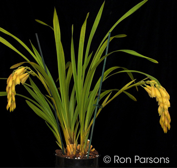 Cymbidium elegans #5419 selfing (approximately 25 seedlings per flask). The Species: As the name implies, this is a truly elegant species. It is found throughout the Himalayas at elevation from 5000 to 9250 feet. In nature it grows as an epiphyte or lithophyte usually near streams. The inflorescence carries 20 to 35 flowers that are lightly scented. This species is more compact than many of the standard Cymbidium species Culture: I grow this in a terrestrial mix in moderate shade in the summer and moderately bright light in the winter. I have also grown it in a fine bark mix. It can be grown intermediate to cold. I now give mine a drier rest in the winter, but have bloomed it successfully with no dry rest. During the growing season it is watered and fertilized most every day. I don't find this any more difficult than any of the other Himalayan Cymbidium species. Parent plant: Cymbidium elegans #2