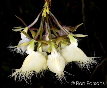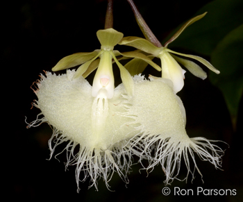 Epidendrum ilense #5854 outcross (approximately 25 seedlings per flask). The Species: A very distinctive member of the genus Epidendrum that has a cane like pseudobulb and an unusual blooming habit. The first inflorescenc is formed at the apex of the pseudobulb which continues to form clusters of buds over a long period of time. When that is finished another inflorescence will be formed at nodes below. An inforescence starts with a cluster of about 3 to 7 flowers and when the first flowers fade a new clusters are formed. In the last image, you can see that this process produces many flowers over time. New inflorescences are produce on both new and old pseudobulbs. A well grown plant can be in bloom for a very long time. The fragrant, white flowers have a beautifully fringed lip. The literature says the pseudobulbs can reach are about 20" tall, but I just measure the tallest on one of my plants and it is 51" tall. The growths are upright with a bit or arching at the top but don't take up much space on the bench. Some may benefit with staking to stabilize the center of gravity if potted. It comes from Ecaudor very close to the equator in the western foothills of the Andes from a very small area at an elevation of 1750 ft. It grows as an epiphyte in very wet cloud forest. I have never tried growing this mounted, but it should be interesting. Culture: This does best for me in warm conditions (nights 60F or more) in moderate to moderately bright light. I have grown in potted in a fine bark mix in plastic and in sphagnum moss in terra cotta. It does best for me when it isn’t allowed to dry out for any period of time. Epidendrum ilense: I do not have images of the actual parents, so show several images of plants in my collection.