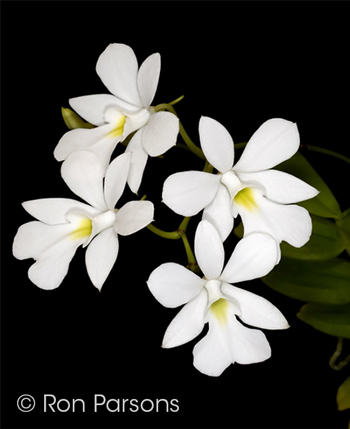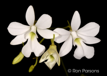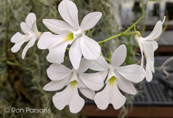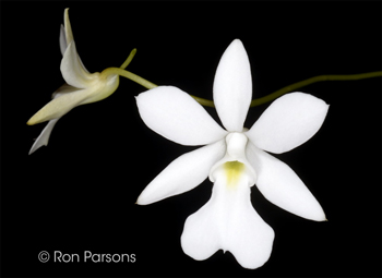 Oeonia volucris #5211 outcross ('Osman' x ''Rocky')(approximately 25 seedlings per flask). The Species: Found in eastern coastal forests in Madagascar. The plant has a bit of a rambling habit since it grows scrambling through the canopy. References disagree on the elevation range; all start at sea level and go from 330, 4000 to 5000 ft. The name, Oeonia volucris, is pronounced ee-OH-nee-a vo-LU-kris. Culture: Grow in warm to intermediate conditions. It is traditionally grown mounted especially if you can give it good humidity. It is helpful to drape the plant with Spanish moss (Tillandsia usneoides), if available, to keep the humidity at the roots. I have grown seedlings to blooming size in compot in a fine bark mix. Capsule parent: Oeonia volucris 'Osman' Pollen parent: Oeonia volucris 'Rocky' |