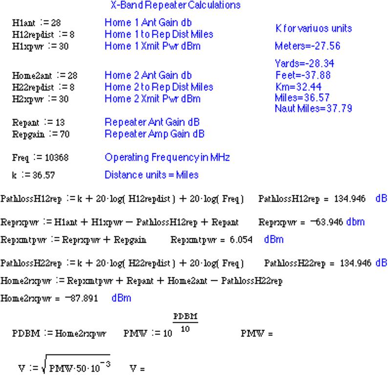 Two stations running SSB with 30" dish antennas and .3 watts and 8 watts at distances of 20 miles and 10 miles lined up their antennas on the beacon and began communicating. Both stations received each other "S9" when the repeater was operating and barely copy able when the repeater was turned off. The station at 20 miles also noted that the beacon level increased about 8 dB when the repeater was turned on. 7 different stations have worked through the repeater. Test have indicated that the overall apparent gain of the repeater is about 10 dB lower than expected. The measured system gain based on data from two sites located 8 miles from the repeater is equivalent to having two 13 dB antennas with 70 dB of amplifier gain. While in operation from about Nov 95 to June 96, the repeater has successfully supported SSB, NBFM, ATV (AM), Full Duplex WBFM (30 MHz Offset centered around 10368 MHz), and 1200 Baud Packet. At the end of this document are a block diagram, a printout of the MathCad signal strength calculations and a chart showing the calculated received signal for two repeater users with varying distances from the repeater.