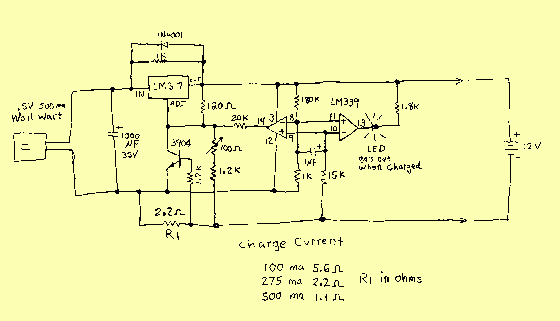 After unit is built the max voltage needs to be adjusted for about 13.6V. This is done while the 20K resistor is removed and it's put it back in after. The 20K resistor is what lowers the voltage after a full charge is reached and if left in while adjusting you would be measuring the lower set point. The max charge current sense resistor has the familiar .6V drop across it so I=.6/R approximately. A 5.6 ohm is good for 2 to 4 amp- hour batteries, 2.2 ohms for up to 8 amp hours, and 1.1 ohms for 20 hour and up. I'll keep to an 8 amp or less for my bicycle though. A 1.8 ohm resistor works the best around here. Check back later for photos.