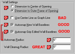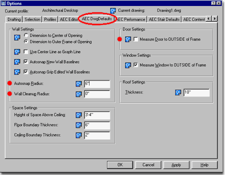 Dimension to Outer Frame of Opening - see comment above. This will run Dimension Extension Lines to the outside of Frames which will result in "Rough Frame" opening dimensions and not the more common finished opening dimension so you may prefer to use the Center option or remove the Frames from Doors and Window objects. Use Center Line as Graph Line - setting this option basically contradicts the default structure of baselines within Wall Styles and is thus highly discouraged as an option. If Centerlines are desirable for the graph lines, Walls should be drawn Justified as such. Autosnap New Wall Baselines - this option controls how Walls behave when you get them near each other. Having the Autosnap feature active helps to get Wall to auto-cleanup because they will connect within the Radius specified on the Autosnap Radius value field. Autosnap Grip Edited Wall Baselines - this option helps to emulate the effect of what the Autosnap New Wall Baselines achieves when Wall are being drawn. In other words, once a Wall has been drawn but was moved away from one it used to clean up with, this value will produce a similar Autosnap when the Grip Stretch tool is used. This option uses the Autosnap Radius value as well. Autosnap Radius - this option sets the distance the graph line of a wall object will travel beyond a picked position when detecting another wall object. Wall Cleanup Radius - since the Autosnap Radius is the first attempt at getting walls to cleanup properly, adding a Cleanup Radius is somewhat redundant. Therefore, the Wall Cleanup Radius should be set to zero by default. It can be changed for Walls that have special problems on an as needed basis via the Override Wall Cleanup Radius tool. Wall Styles also have an independent option for a default Cleanup Radius. Space Settings |