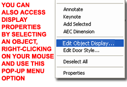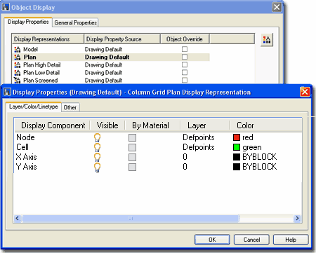 access the Column Grid Display Properties: via the Context pop-up menu. Illustrated to the right I show the Display Properties for the "Plan" Display Representation and the four Display Components that you will find for every Display Representation ( Model through Plan Screened ). By default, the Node and Cell Display Components are not Visible and you may never need to make them Visible since their function is designed for Anchoring Objects like Columns more so than for printing. |