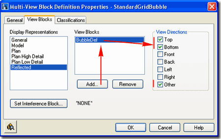 Column Grid bubbles are Multi-View objects so you may find that they don't show up in some of the Display Representations that you want to work with, like Reflected Ceiling plans. Illustrated to the right, I show how you can add the display of Column Grid bubbles to any Display Representation. Select any Grid bubble, right click on your mouse and select Edit Multi-View Block Definition... from the object-specific pop-up menu. On the Multi-View Block Definition Properties dialogue box, select the View Blocks tab and select the Display Representation that you want to Add... your Multi-View Block to. Once you have Added your Multi-View Block, use the View Directions to specify which views you want the Multi-View block to show up on. |