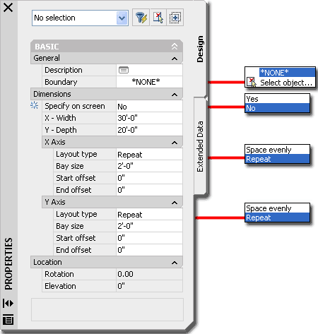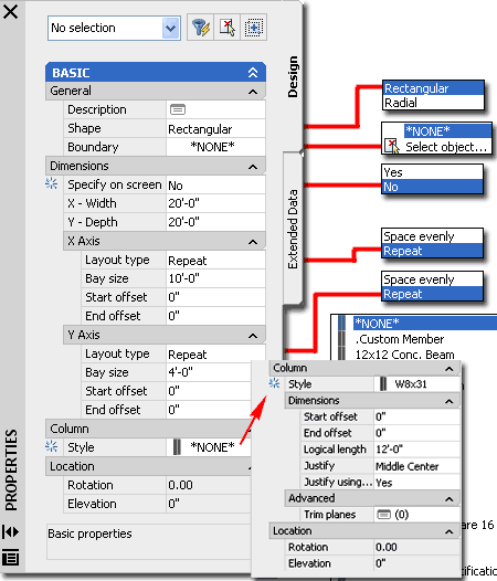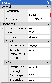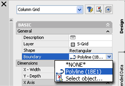 When Adding Column Grids, the Properties Palette offers two basic Shapes ( Radial and Rectangular) and several options for spacing the grid lines. You can Add Columns automatically before placing the Grid on your screen but there is no option to do this automatically after placing the Grid. If you need to create a Column Grid that is not evenly spaced, create the closest layout and modify it after placement. GENERAL Boundary - this drop-down list offers the option to "Select object..." for using a closed Polyline shape to clip the Grid. This is far more typical for Ceiling Grids.
