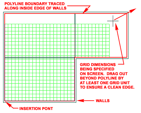Grids, allows you to specify Often a grid layout will not match the interior dimensions of a space and thus you will find it difficult to create a grid that stops right where the Wall does. My personal trick for solving this type of problem is to first define the whole interior space with a closed polyline and then use the Boundary option to crop the ceiling grid to within this perimeter. You may need to define a ceiling grid that goes beyond the interior space so that the grid lines actually carry all the way to the edges. To Set a Boundary, after the creation of a Ceiling Grid, see Clip Ceiling Grid below. |
