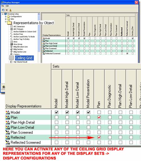 By default, the Ceiling Grid Object will only Display in the Reflected Display Configurations and at times designers prefer to see a drawing in Plan while designing a Ceiling so here's what you can do. The Ceiling Grid Object actually has the option for different Display Representations for Model, Plan, Plan High Detail and so on but none of these are utilized in the default template files. By using the Display Manager, you can access the Ceiling Grid Object under the "Representations by Object" folder and activate one or more of these Display Representations. Illustrated to the right I show the default list of Display Representations for a Ceiling Grid Object and how none are used for the Plan, Plan High Detail or Plan Low Detail Display Sets. If you want your Ceiling Grid to appear in Plan as it does in Reflected, simply check the corresponding box as illustrated to the right. Another option is to Modify the Plan Display Representation and then activate it for the Plan Display Set. You might, for example, make the Ceiling Grid appear in Plan but not printable. |