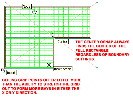 Grip Points and OSNAPs The four Grip Points that you have for working with Ceiling Grids can quickly prove to be rather disappointing because of how they affect the Grid. Though you can use them to Stretch the overall Dimensions in any of the four directions and consequently increase or decrease the number of Bays, the Grid does not remain static in position; i.e, existing grid lines will adjust if the Insertion Point is affected by the Grip Stretching. In addition, Offset Values set on the Properties Palette reposition the Grip Points leaving you with no visual cue about the Offset.
