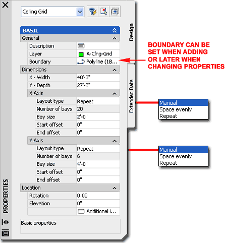 When Adding Ceiling Grids, the Properties Palette offers the option to set a Boundary and several options for spacing the grid lines. If you need to create a Ceiling Grid that is not evenly spaced, create the closest layout and modify it after placement. GENERAL