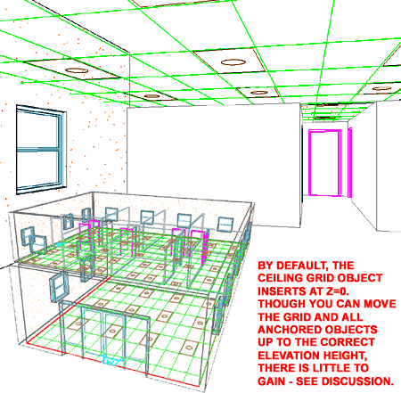for Presentation By default, Ceiling Grid Objects Insert at an Elevation Height of zero and that is actually the best position since other Heights can cause the notorious cross-plane linework issue that many AutoCAD users are all too familiar with. The primary problem with a Ceiling Grid at the ground plane is that it makes no sense to have it there when you use your drawing for 3D Related work; from simple Perspectives to Generating Sections and Elevations. What you have to consider is the purpose of your Ceiling Grid which is typically Construction Documents. This means that you may have to think of your ceiling work as two separate tasks and possibly even separate files; one for CD's and one for Presentation use. For those wanting to Render ceilings, for example, this 2D Ceiling Grid Object and its associated 2D MvBlock Light Fixtures produce nothing because there is no 3D Geometry to map Materials to. Some solve this problem by adding a Slab that can then receive a generic t-bar ceiling material. At times I have found that I actually needed a 3D Ceiling Grid because of the numerous places that I wanted it to display correctly. For work like this, though I caution against it, I have used Curtain Walls that I turned sideways through the z-axis. In the illustration to the right I show that the Ceiling Grid Object and its associated MvBlock Objects will display in Shaded Views and can be good enough for simple presentation output. |