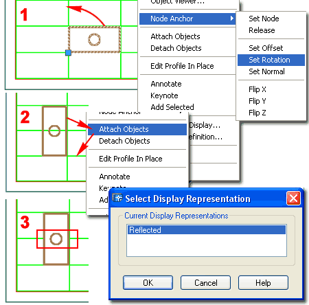 When using Architectural Desktop's Electrical Fixtures, like the fluorescent 2x4 lights, you will be prompted to "Select Layout Node" which Anchors the Multi-View Block to the closest Ceiling Grid Node near your Selection. After you have Anchored the Object to the Ceiling Grid Node, you may find that some forms of manipulation are tricky; such as Rotating. Rotating an Anchored Object For cases where you need to Trim a Ceiling Grid Line, you may be able to take advantage of the Masking feature within some of the default Ceiling Fixtures. The 2x4 Fluorescent Light is actually not a true Multi-View Block but rather a Multi-View Block nested inside a special type of Block called a Mask Block. The Mask Block holds a 2D Closed Shape that will act as a Wipeout but can also hold other Graphic Objects such as a Multi-View Block. Masking a Ceiling