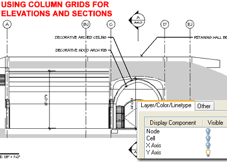 and Elevations For projects where you need to use Column Grid Labels, invariably those Column Lines and Labels need to travel through numerous documents such as Elevations and Sections. Illustrated to the right is an example of how I take the same Column Grid from my Floor Plan and drop it over my Sections. After some minor adjustments, the grid ends up working fairly well. By using the option to turn the Visibility of the X or Y-Axis Display Components Off, you can use the Column Grid as a series of lines rather than a Grid. Now if I could just find a way to link the Plan Grid to all of my Section and Elevation Grids I wouldn't have to run around and Grip Stretch them whenever the Plan changes. |