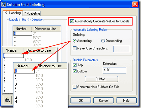 Ascending - check this radio button to have numbers and/or letters increase from the Grid's origin out; e.g., 1, 2, 3, 4... Don't bother trying to get combinations like 1A, 2A, 3A... because all you will get is 1A, 2B, etc. Descending - check this radio button to have numbers and/or letters increase from the farthest Grid line out back to the Grid's origin; and I do mean backwards because you will have to calculate the top number by counting backwards; i.e., you will need to type the highest number of your grid bubbles on the top line in the Number field. You cannot simply go to the last column number field and type "1" or "A1", which would be more logical. If you have a whole lot of bubbles, try using Ascending first to calculate the last number and then switch to Descending and type in the last number for the 1st value field. |