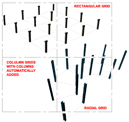 Note: Illustrated to the right, I show a Rectangular and a Radial Shaped Grid with Columns that were automatically Attached when the Grids were placed. Any change to the Column Grid will affect the position and number of Columns. If you expand the size or number of Gridlines, you do not automatically get new Columns for those new Node points. Likewise if you reduce the Grid size and then expand it once again, you lose Columns. At least it is pretty easy to repopulate a Grid by Copying the Columns or by using the Node Anchor Tool. |