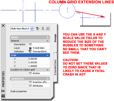 Grid Extensions Unfortunately the Column Grid object was not designed with Extensions in mind and thus you will have to resort to creative solutions. Illustrated to the right, I show one of those solutions you might use in a desperate situation. By Adding Grid Bubbles to all sides, you can select all of the Grid Lines and Bubbles on those sides where you want an Extension Line and simply use the Properties Palette to set the Grid Bubble Scale to something incredibly small - see illustration to the right. If you ever wish to restore the Modified Grid Bubbles to the same scale as their counterparts, use the ColumnGridLabel command to "Generate New Bubble on Exit". A better solution would be to create a StandardGridBubble_Blank and use it in place of the default Grid Bubble, but sometimes we just don't have the time or patience to do what might make better sense. |