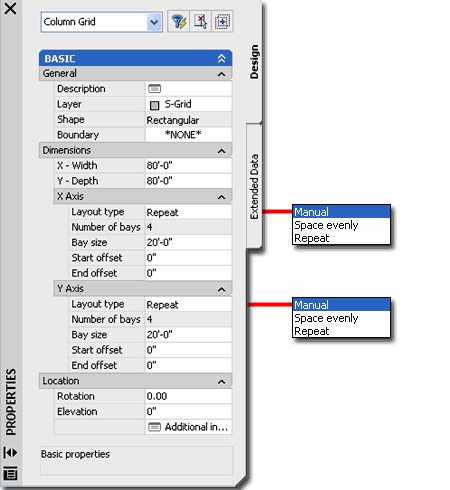 When Modifying Column Grids, the Properties Palette offers all of the same options found when adding these Objects. You will also be able to Modify the Rotation and Elevation height. Under the Layout Type drop-down lists, you will now find a new option for Manual.