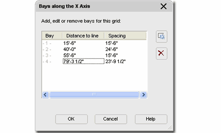 Unfortunately, there is no option to Add Columns automatically as when Adding a Column Grid. Illustrated to the left I show the Context pop-up menu and how it too offers the option to set the Grid Spacing to Manual ("Layout Mode"). In addition to this, you also have options to Add or Remove Grid Lines. When you set the Layout type to Manual, you should find that the option for spacing is now controlled by the Bays dialog box - see illustration below right. |