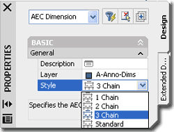 If you use the AecDimAdd command, you can dimension a Column Grid Object much like you would any other ADT Object; One side-at-a-time. The benefit of this option is that Aec Dimensions automatically adjust to the Grid. Illustrated to the left I show the Properties Palette and the default Style options you can Select from when adding Aec Dimensions to Grid Objects. Illustrated in the upper right corner I show how you can use the Edit In Place feature of Aec Dimensions to move or adjust them as needed after adding them to your Grid Object. |