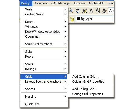 | How do I get this toolbar? You can also acquire access to these commands from the Alternate Design pull-down menu. From the Design pull-down menu, pick Grids > and cascade to their respective command options - see image below, right. Illustrated to the right is the Grids Toolbar but there is another similar set of tools on the Layout Tools toolbar. The primary difference between the Grids and the Layout Tools has to do with how these similar objects are set to display. A Layout Grid, for example, has only one "General" display option (either on or off) where a Column Grid can be set to display in either Plan, Reflected Plan and/or Model orientations. This means that for Columns, it is better to use the Column Grid if you want the Column Grid as part of the annotation instead of as a drafting/design tool that isn't printed. |