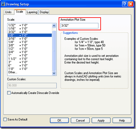 ![]() Originally the Annotation Plot Size was set to 1/8" for the Imperial users but most designers found that this produced Symbols with Text that were too large. In ADT 2004 the number was changed to 3/32" as a new default and it seems to work rather well for most. I, of course, recommend that you run some tests before accepting this value. Typically it does not need to be changed when you change the Drawing Scale. |
