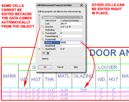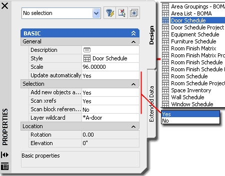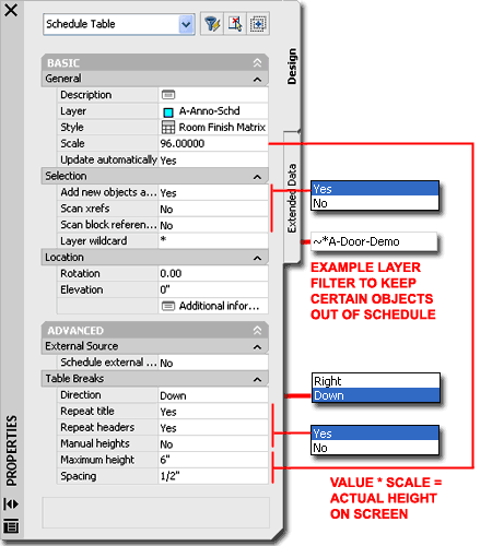 When adding Schedule Tables, the Properties Palette offers a fairly limited list of options but you don't really need that many. Be aware that the options do change on the Properties Palette when Modifying an existing Schedule Table. GENERAL Scale - this value is derived directly from the Drawing Scale and should not be changed unless you have a full understanding of how this value affects the Schedule Table and Printing output. It may be unfortunate that you cannot simply add your Schedule Tables in a Layout at 1:1 scale but then it might be more difficult to jump between Cells and Objects. Therefore, you typically must Add your Schedule Tables in Model Space (unless you have data in a Layout) at a Scale equivalent to the intended Printing Scale and use a Viewport to arrange the Schedule Table in a Layout. Automatic Updates - the automatic features may be a system problem for large drawings with hundreds of symbols. One example of this would be when you make changes to the size or type of Door or Window; the schedule will reflect this change automatically. I don't use this feature but simply update the schedule when I want it updated. SELECTION |
