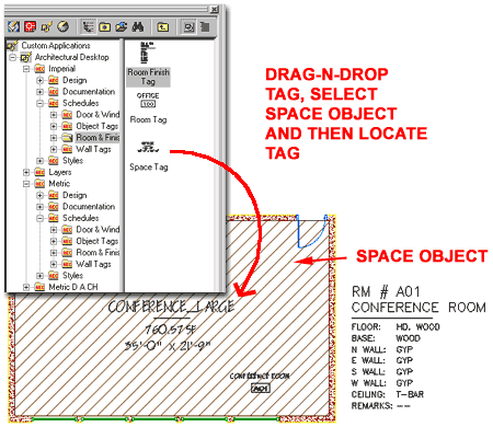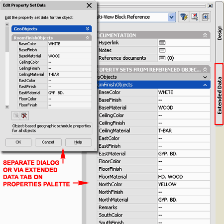 Illustrated to the left and right I show one of the default Room Finish Tags and some of the Data Fields it offers when Attached to a common Space Object. One of the first things you may notice is that the Tag itself does not display all of the Data Fields seen under the RoomFinishObjects section of the Extended Data dialog. A Tag does not necessary have to display any of the Data Fields and if you want to Add or Remove Data displayed by the Tag, you will need to read up on creating your own Tags. The full list in your Schedule Data comes from the Property Set Definition Styles and you add or remove these Styles with the Add.. and Remove... buttons on the bottom of the Edit Property Set Data dialog box. This is how you could start with basic Window sizes and numbers, for example, and then later add another Property Set Definition for more detailed information like cost, manufacturer and so on. |
