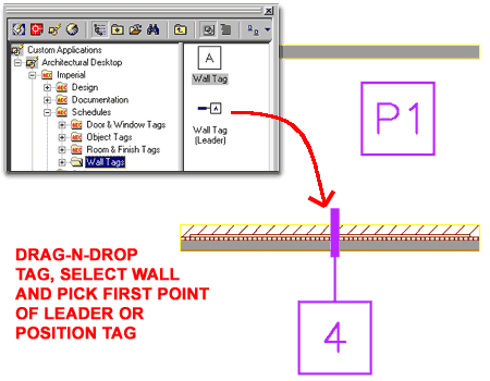 From the DesignCenter, you simply drag-n-drop one of these symbols into your drawing and then select a Wall for it to be associated with. You must select a Wall because that is how the tag derives the information used to generate a schedule table. When you have selected a Wall object, the tag will need to be positioned and you can either manually pick a position or hit enter to automatically Center the tag on your Wall. The simple Wall tag only has to be positioned while the Leader Wall tag needs to be placed by first picking the beginning point of your leader, the second point of your leader and the final position of your Wall tag. |