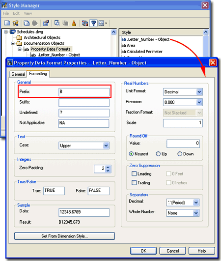 The Property Data Format Styles control how you want the data or text in your Schedule tags displayed and formatted. One of these Styles, for example, is responsible for the way your Door tags start with the number "01". Given that we not only have preferences for how we like to number our Doors and Windows but what information we wanted included, you can use the Formatting tab of the Property Data Format Properties dialog box to Add Prefixes or Suffixes, control the number of characters, unit type and round off values. On a Door or Window tag, for example, this is where you can use a Prefix to specify which floor your tags refer to ( note: you can also use the Project Based Tags but that requires that you use the Project Management System). In the illustration to the right and left I show that I have Copied the default |ab Number - Object Property Data Format Style and used it to create a new one that I called |ab Letter_Number - Object and set the Prefix value to "B". To recreate this type of result, you will need to modify the Property Set Definition Style as well and set the Format field of the affected Property Definition Name to any new one you have created. I will elaborate on this process under the Property Set Definition Styles discussion below. GENERAL Suffix - a letter, number or combination of both that will