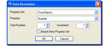![]() Property - this drop-down list will probably only offer one default option, "Number", until you really dig into custom settings for your Schedule Data. This option is tied to the Property Set Definition Styles and the Name used for Numbered items. Attach New Property Set - this checkbox will attach the Property Set selected on the Property Set drop-down list to the objects that you select for Renumbering. This means that if you know that you want to Add another more elaborate list of information to the basic set, you can now do it while Renumbering. In other words, since you are manually selecting your objects, one-by-one, you might as well take advantage of anything else you can do with Schedule Data. |