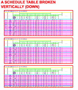 GENERAL Update Automatically - see comments for Adding Schedule Tables. The option to turn this feature On and Off (Yes/No) can be used as a performance control for projects that make computers run slower. SELECTION LOCATION EXTERNAL SOURCE TABLE BREAKS Direction - use this drop-down list to chose between positioning schedule table segments vertically (Down) or horizontally (Right). Repeat Title - use this Yes/No drop-down list option to include or exclude the main title on your Schedule Table. |